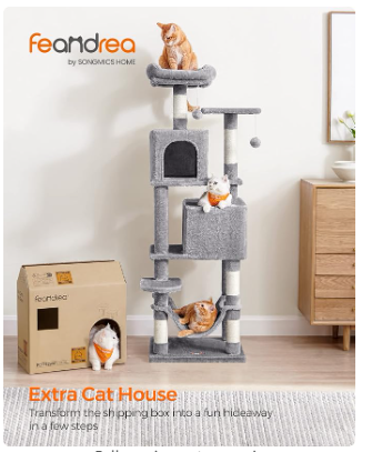 (Unassembled) - Cat Condo, cat tree, 61-Inch Cat Tower with 5 Scratching Posts, 2 Perches, 2 Caves, Hammock, 2 Pompoms, Light Gray (1 Box, Unassembled)