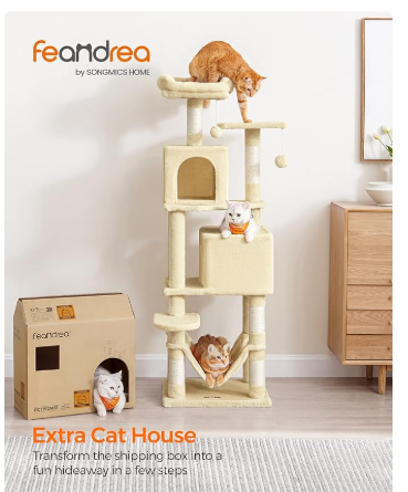 (Unassembled) - Cat Condo, cat tree, 61-Inch Cat Tower with 5 Scratching Posts, 2 Perches, 2 Caves, Hammock, 2 Pompoms, Beige (1 Box, Unassembled)
