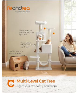 (Unassembled) - Cat Condo, cat tree, 61-Inch Cat Tower with 5 Scratching Posts, 2 Perches, 2 Caves, Hammock, 2 Pompoms, Cream White (1 Box, Unassembled)
