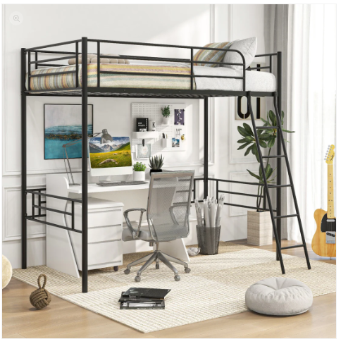 *SPECIAL* - Twin Metal Loft Bed Frame with Ladder and Metal Slats Support-Black