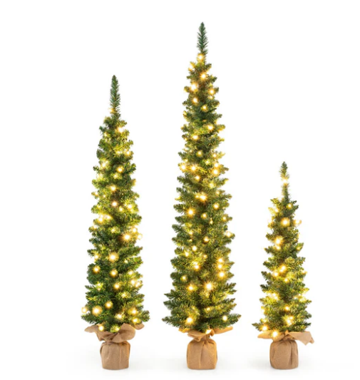 Set of 3, Pre-Lit Pencil Artificial Christmas Trees with 415 Green Branch Tips, Green, ASSEMBLED, FINAL SALE