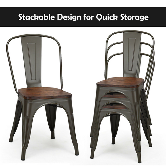Set of 4 Tolix Style Metal Dining Side Chair Wood Seat Stackable Bistro Cafe