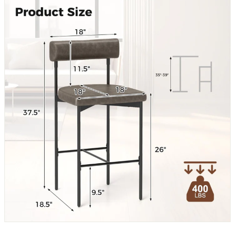 2 Piece Set, Counter Height Bar Stools, 26 Inch Upholstered Bar Chair, Caramel