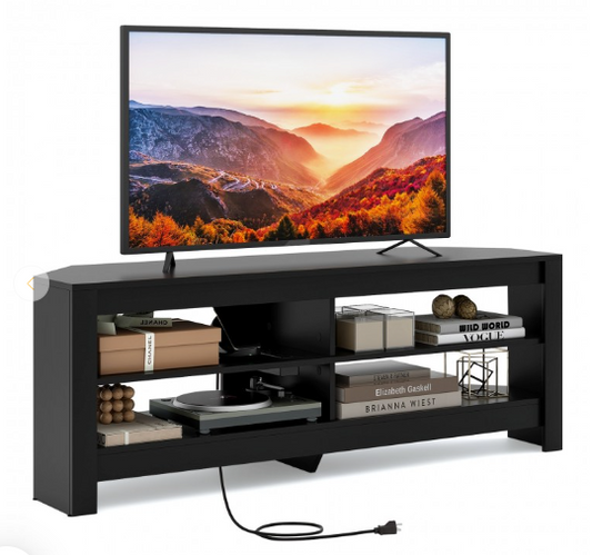 Corner TV Stand with Power Outlet and 4 Open Storage Shelves, Black- (Scratch and Dent)