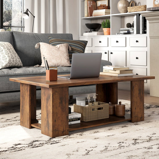 Large 41 Inch 2-tier Wooden Modern Coffee Table with Storage Shelf-Brown (Assembled)