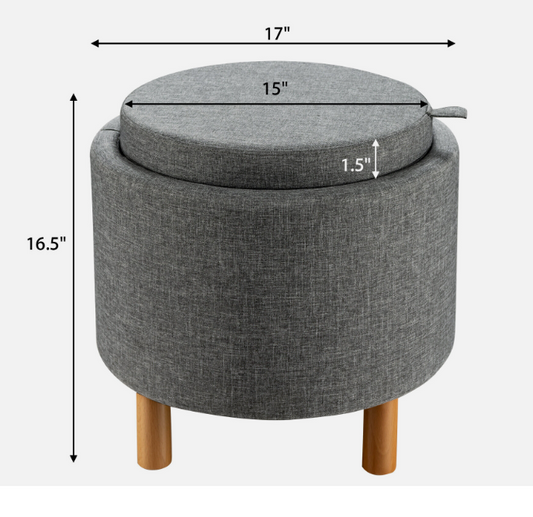 Round Storage Ottoman w/Wood Legs w/Tray Top Accent Padded Footrest Gray