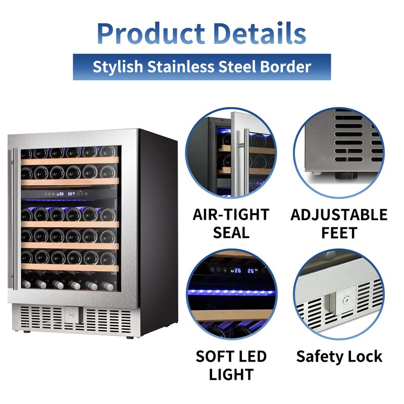 - Advanced cooling and air circulation system: Wine beverage cooler with upgraded cooling system. Combining with a fan circulation system and low vibration compressor, the wine cooler ensures quick cooling and quiet performances, and store your wine to keep the good taste.