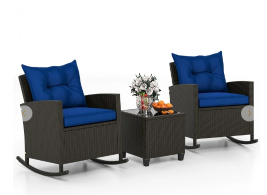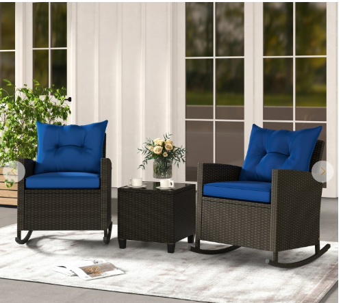 3-Piece Patio Rattan Rocker Chairs with Glass Table, Dark Blue (Fully Assembled)