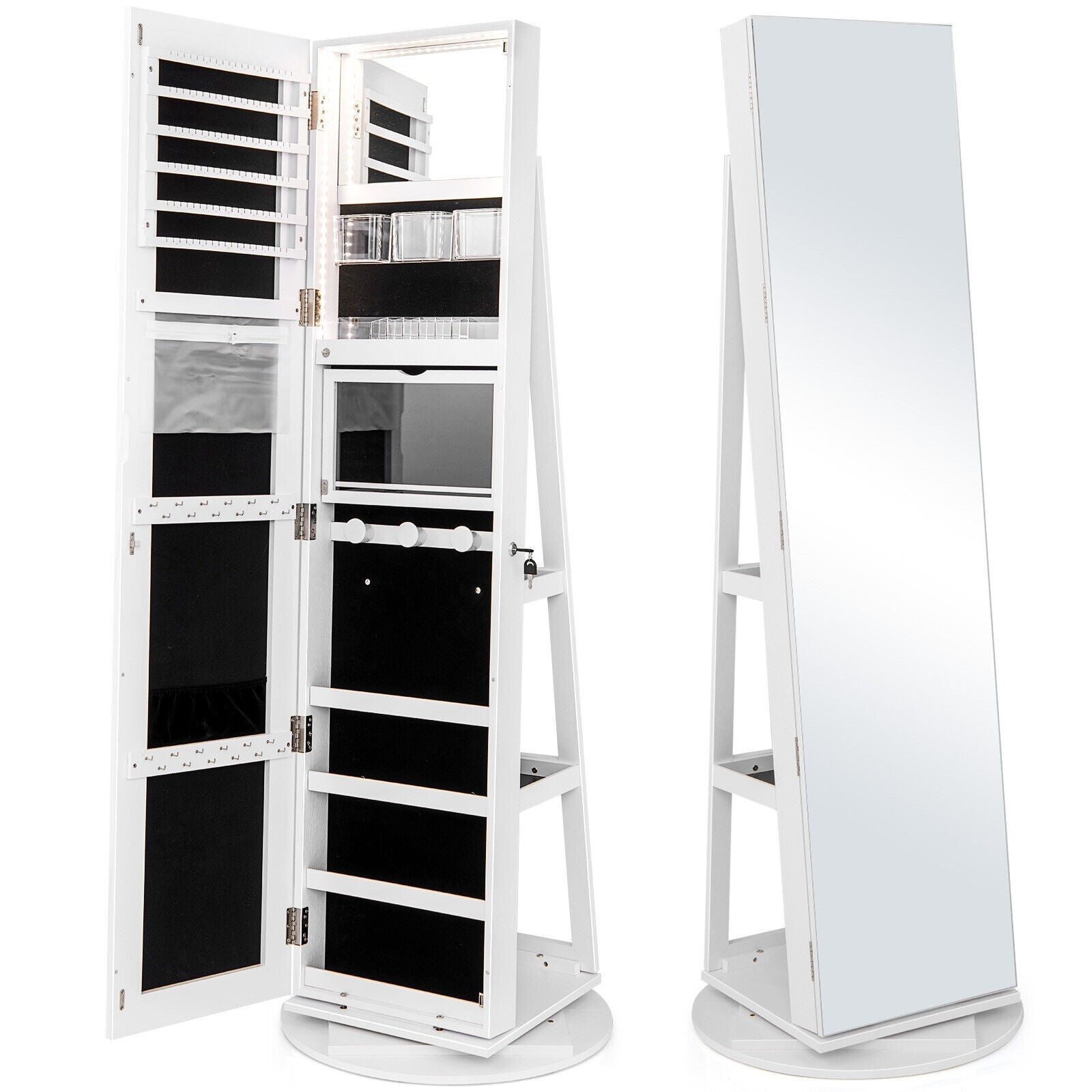 And the inside space is divided into lots of storage partitions with hooks slots and more which helps you organize jewelry and cosmetics well. The base is 360° rotatable so you don’t need to be worried about taking items on the back storage shelves. More importantly the mirror inside the cabinet is equipped with LED lighting that features 3 adjustable colors. And the folding acrylic table is convenient to placing makeup tools. The cabinet door is lockable with the included keys if needed. Made of premium MDF material the stability and durability of this freestanding jewelry organizer is assured.