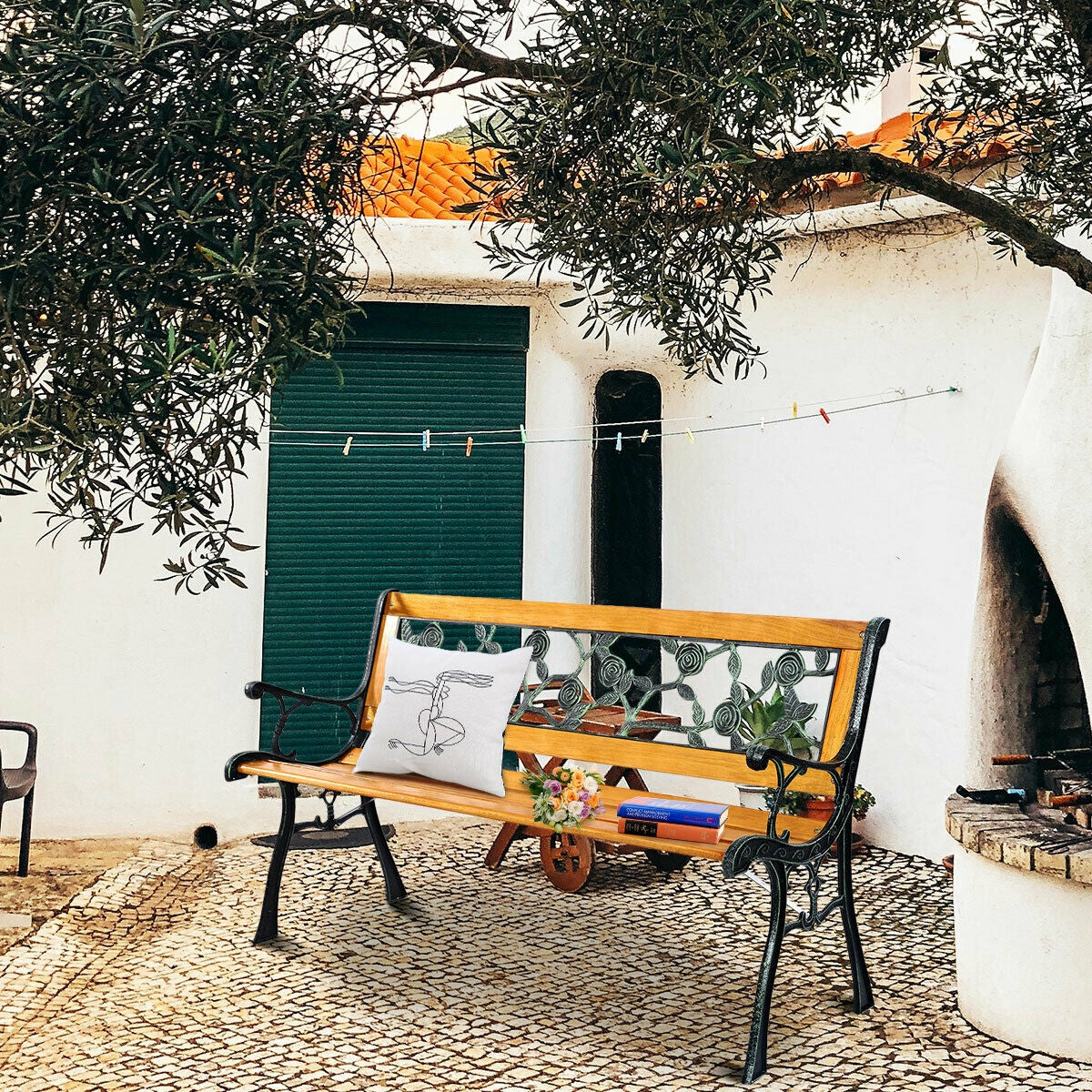 This garden bench features an iron-cast and ruggedly durable solid-wood structure.