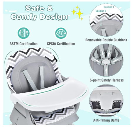 ● Stable and Safe Construction: The tray is made of BPA free PP material and the seat cushion is soft and skin-friendly. 4 legs form a stable pyramid structure and 4 enlarged supporting feet effectively prevent tip-over accidents. Also the 5-point safety harness and anti-falling barrier add additional security.