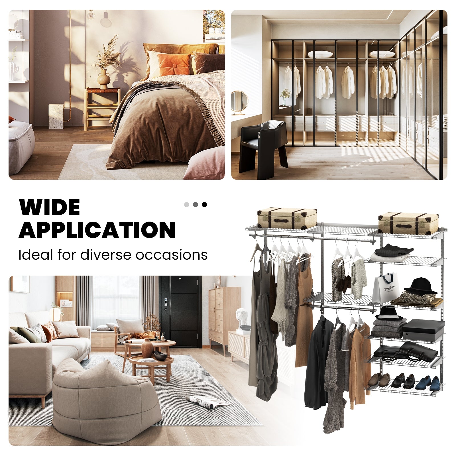 These organizers fit closets range from 4ft to 6 ft wide and allows for adjustable shelves so that you can customize to perfection including 3 sturdy hanging rods a 5-shelf expanding cubby unit and 4 open shelves provide 75" hanging space and 230" shelving space with full adjustable height. The wire shelves are coated to safeguard against rust or chipping. All necessary hardware and a step-by-step template are included for easy installation. Moreover you can maximize your storage space by adding other configuration accessories such as wire baskets Telescopic trousers rack and more.