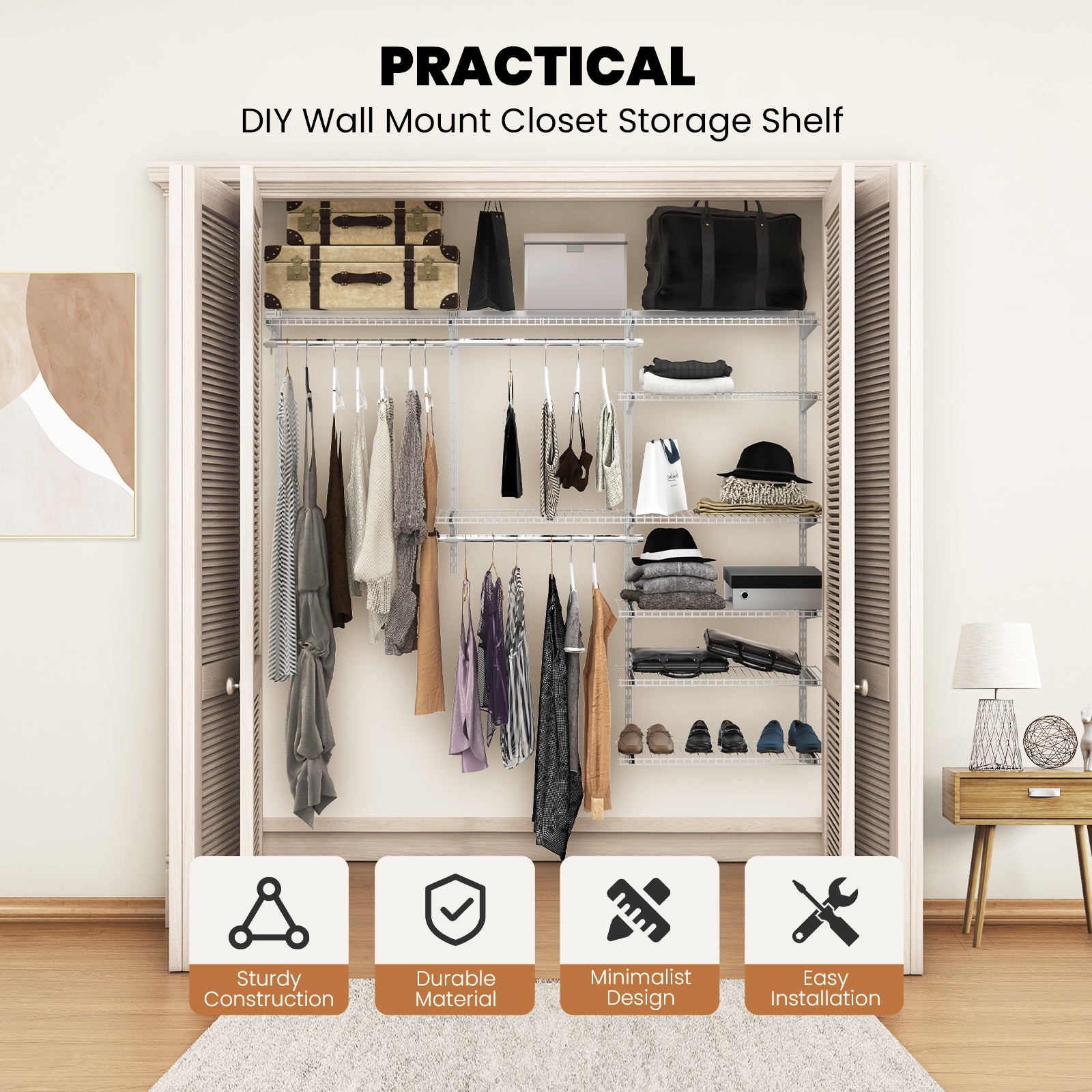 ● Multi-Tier Enlarged Storage Capacity: Configuration for 4 ft. to 6 ft. wide closets shelving is 15-inch deep. This customizable configuration closet kit brings the reach-in closets to the next level of convenience with its multi-tier fixed-mount design. Features 75" hanging space and 230" shelving space this enlarged closet organizer can accommodate everything from dresses and suits to sweaters and handbags etc.