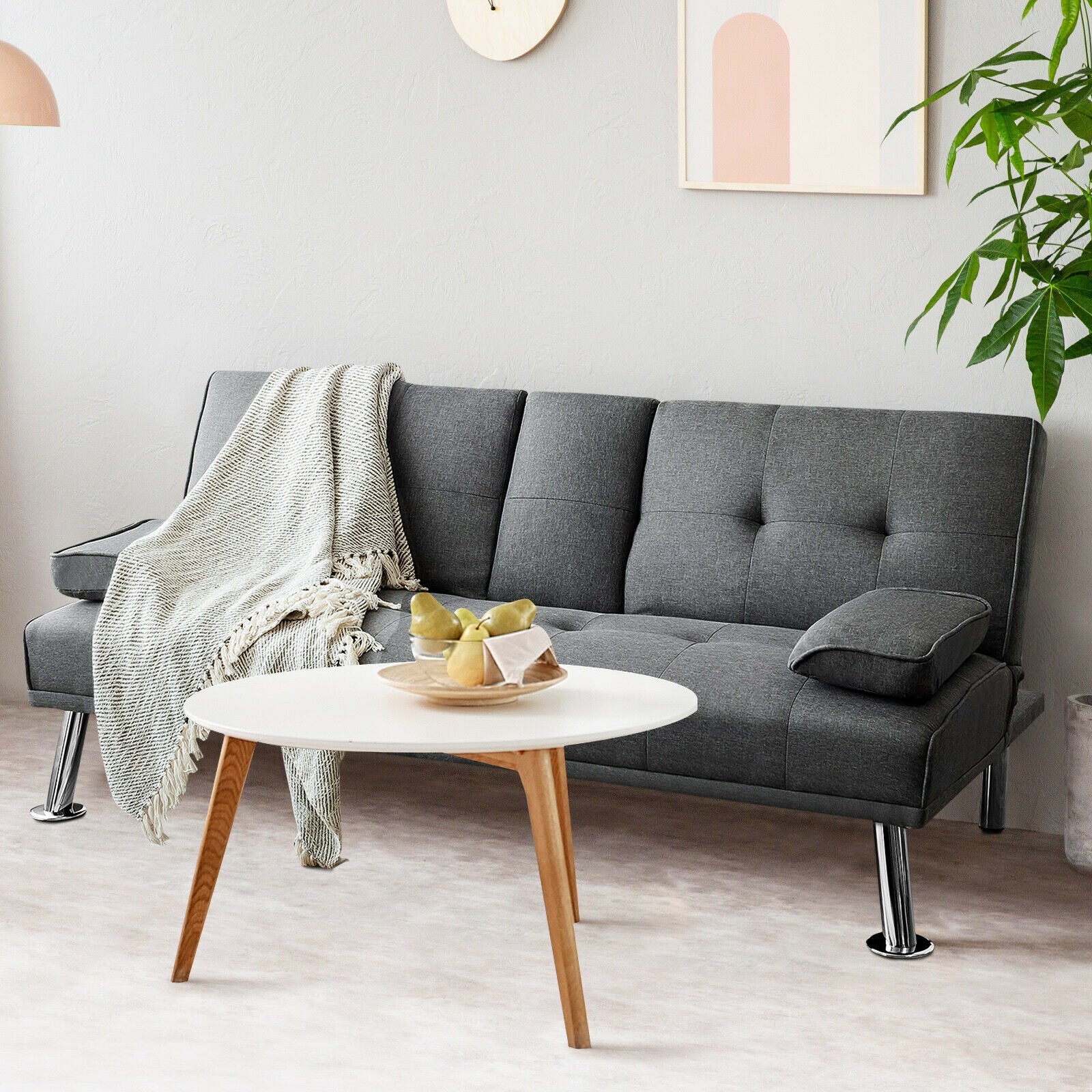 Convertible Folding Futon Sofa Bed Fabric with 2 Cup Holders-Dark Gray