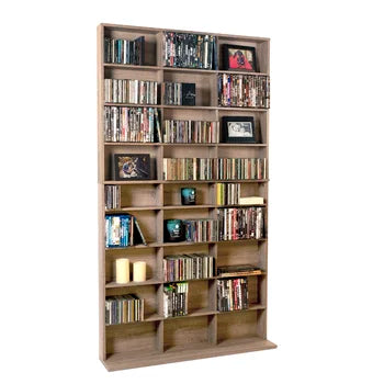 You have a large media collection and want to organize your movies, video games, and music. This versatile media shelf features 9 shelves, a wall anchor kit, and storage for Blu-ray, DVDs, CDs, and games. The sturdy traditional design has new wider side panels, improved assembly, extended base, and a weathered oak finish. Store up to 624 Blu-ray or 528 DVDs or 837 CDs or a combination. Gamers can store 624 PS4 game cases.