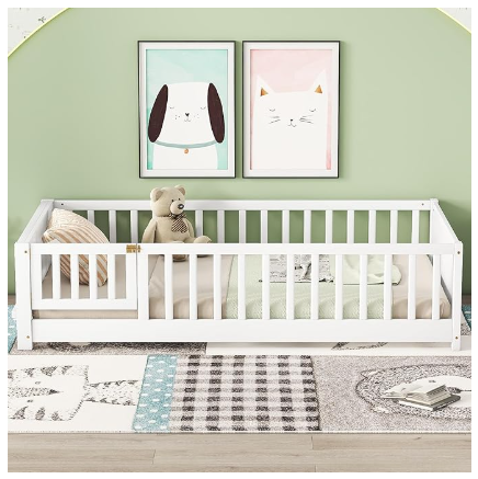 - đ¨ăDurable Solid Wood Frame with Safety FenceăBuilt with high-quality pine wood, this full montessori floor bed offers excellent stability and durability. The solid slatted base supports full-size mattresses without need for a box spring, and the fence structure keeps children safe from rolling off during sleep or playtime.