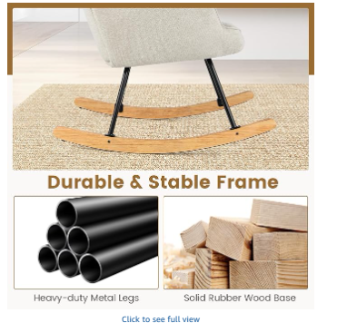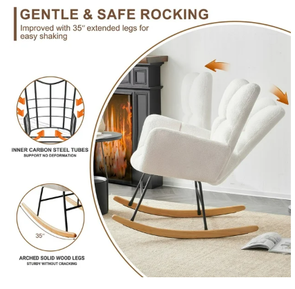 ● Sturdy and Safe Construction: Built with a solid rubber wood base with protective felt pads, the rocking chair ensures stability and durability. The thoughtful extended design of the rocker bar prevents roll-over accidents, offering peace of mind as you enjoy the gentle rocking motion.