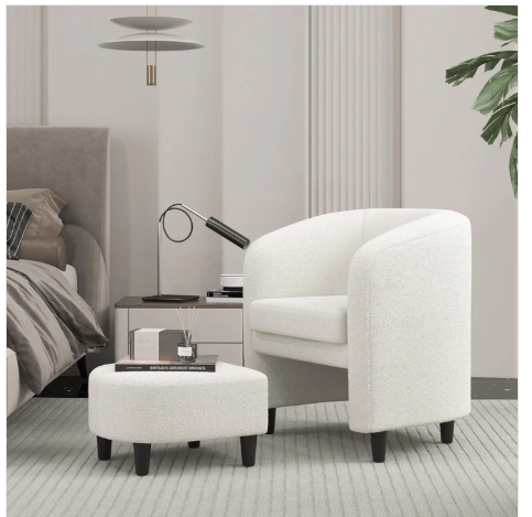 Our barrel armchair and ottoman set is the perfect addition to your living room, bedroom or study room. It has curved backrest, spacious seat and ergonomic armrests that fit well with your body curve. The seat cushion can be detached if needed. Besides, soft teddy velvet, built-in springs and high density sponge ensure a comfortable sitting experience. You can also rest your feet on the ottoman for further relaxation. When not in use, the ottoman can be stuffed under the chair. Furthermore, crafted with solid wood frame and stable legs, the chair and ottoman set stays steady on the ground. And there are non-slip foot pads for higher sturdiness and floor protection.