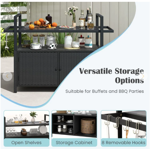 ● Ample Storage Capacity: This outdoor bar cart boasts a generous 2-tier open space and a 2-door storage cabinet, along with 8 removable hooks, providing ample space for all your outdoor entertaining needs.
