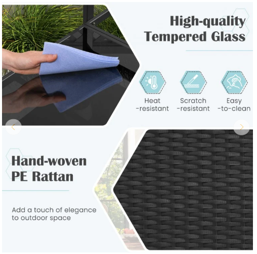 | Material | PE Rattan, Tempered Glass, Metal |
