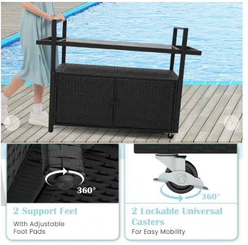 ● Easy Mobility: The outdoor bar cart features 2 lockable universal casters, allowing for smooth and effortless movement across different surfaces. The brake system makes it easy to reposition the cart as needed.