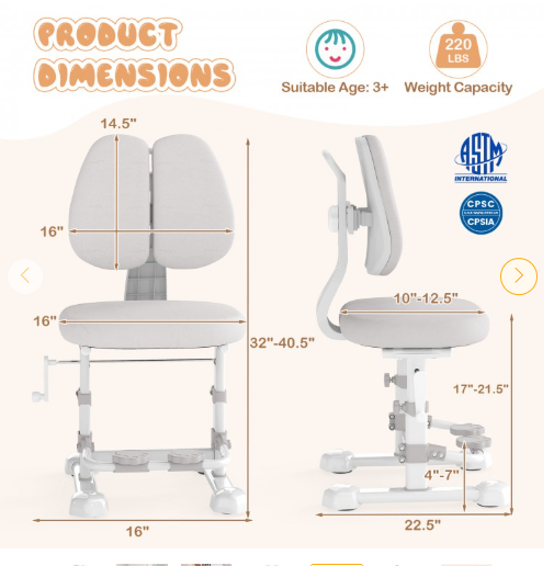 ● Adjustable Seat Height & Depth: The kids' desk chair offers a 2.3" adjustable seat depth, tailored to fit your child as they grow. It also features a stepless seat height adjustment from 17" to 21.5" using an easy-to-use crank system, making it suitable for kids between 3'3" and 5'3" tall.