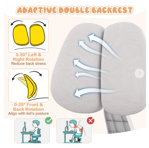 ● Ergonomic Backrest: Our kids chair features an adaptive double backrest with 0-30° left and right rotation to reduce back stress, and a 0-25° front and back tilt to automatically align with your kid's natural posture. Plus, its height adjusts by 5", ensuring a natural fit.