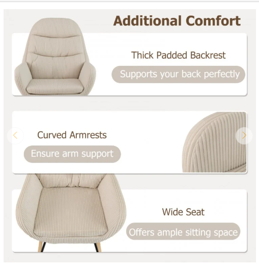 ● Comfortable Materials: The skin-friendly corduroy upholstery adds a touch of warmth and texture to your living space. Additionally the soft sponge filling and built-in springs ensure comfortable support.